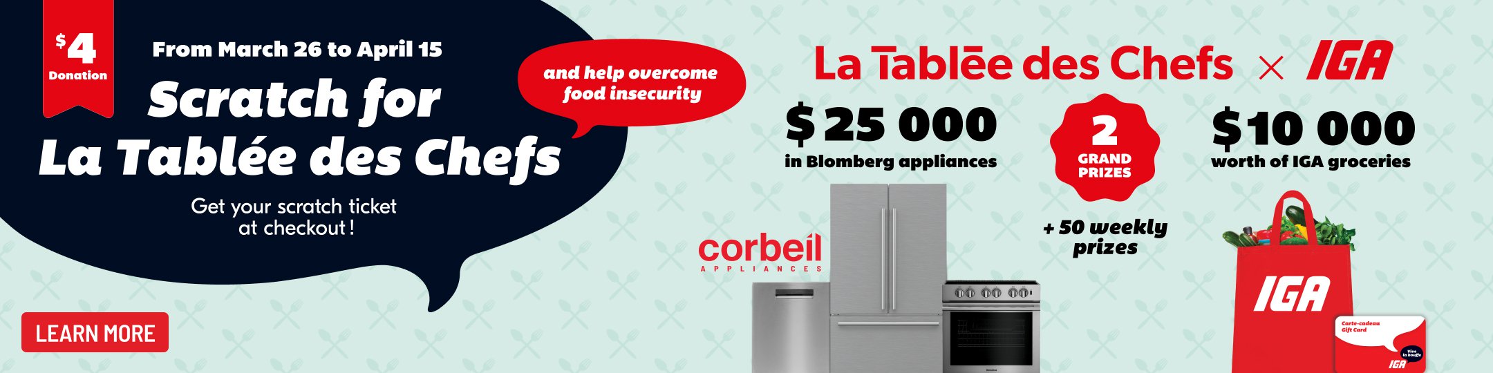 For just $4, get a scratch ticket at participating IGA stores and Corbeil Appliances locations and a chance to win prizes every week. Each ticket also gives you access to the draw for our two exceptional grand prizes, which will be drawn on Thursday, April 23: